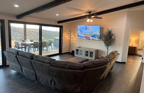 The home features five bedrooms. Starting with a large master bedroom with a Cal King bed and pull-out twin couch. The master bathroom has a soaking tub, and a beautifully tiled shower for two with Rain, Wall and Handheld shower heads, all with views overlooking the valley. To the right of the main entry is a large two queen bedroom that comfortably sleeps four people. On the opposite side of the house from the master bedroom you will find three bedrooms. Two of these rooms have Queen Beds and one of them has two Twin XL (long twins) beds. On this side of the house is another bathroom with a shower.