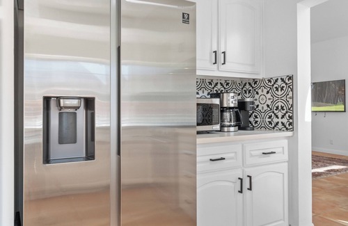 The sleek, new kitchen is a chef’s delight, featuring stainless steel appliances and a massive quartz island with seating for six. Five spacious bedrooms provide plush mattresses, comfy pillows, and high-quality linens, ensuring a restful night’s sleep for everyone. The contemporary modern living room boasts a large smart TV and a dining table that seats eight. There's also an additional seating area next to the kitchen with a loveseat and another smart TV, perfect for cozy gatherings.