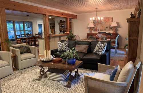 This renovated home with a recent addition sleeps 6 adults comfortably. Our home offers a master suite (queen) and a mother-in-law suite (queen bed) both with ensuite full bathrooms, as well as a bedroom with a double bed and an office with a trundle bed that share a full bath and a half bath. The open floor plan provides guests with informal and formal dining areas, a large kitchen, and a cozy den that includes a sleeper sofa with a queen mattress. The front porch is perfect for relaxing and watching the sunset at the end of the day. Guests can enjoy coffee and the sunrise or a secluded lunch on the back porch. There is a spacious back yard as well as 2 2-bay carports for off-street parking for all of the guests.