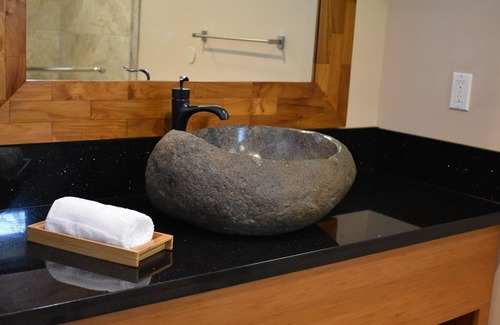 The Asian inspired Garden view Plumeria Room features original carved artwork and furniture imported from Bali, air conditioning, private screened-in lanai/balcony, with serene garden views. Enjoy luxury hypoallergenic bedding and a contemporary tropical bathroom design.