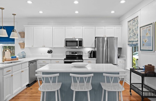 As you arrive at this beautiful home you will notice the large porch with swing and seating. Enter your perfect getaway into the fully stocked kitchen area open dining. This home features stunning coastal decor and plenty of natural light. The kitchen holds everything you need to enjoy your vacation. Spacious dining seats 8 and there is breakfast bar seating for 3. The living area, with plenty of seating, open up to the outdoor patio area with grills and plenty of seating.
