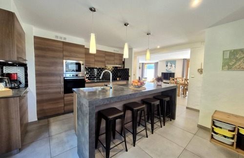 Duplex gîte above the owners' apartment, on the 1st and 2nd floors of the house (access via an independent external staircase). 1st floor: living room (Smart TV) and open kitchen (access to terrace and garden on one level), 1 bedroom (1 double bed 160 x 200 cm), bathroom with bath and shower, separate toilet, relaxation area with infrared sauna and table football. 2nd floor: 4 bedrooms (1 double bed 160 x 200 cm / 1 double bed 160 x 200 cm / 1 double bed 140 x 190 cm with 1 baby bed / 2 single beds 90 x 200 cm) including 1 with TV and private bathroom and 1 mezzanine / sleeping area with access by miller's staircase (1 double bed 140 x 190 cm - height less than 1.80 m), 1 separate toilet, relaxation area with billiards. Large exposed balcony, large terrace and private enclosed garden with private 6-seater spa. All included (linen and cleaning). Firewood provided (from December to April). This cottage combines the ideal characteristics for a multi-generational stay: spaces reserved for each person, equipment to challenge yourself and relax, a beautiful garden designed for long evenings to remake the world... The location of the house in the heart of the Tarentaise leaves the choice of the ski area (La Plagne, Les Arcs, the 3 Valleys) and many hiking or cycling possibilities. The owners will take great care to make your stay a tailor-made experience. In addition to the central heating, the wood stove will bring you a soft and comforting heat; a large chest filled with wood is available (equivalent to 4 bags), as well as kindling and natural firelighters.