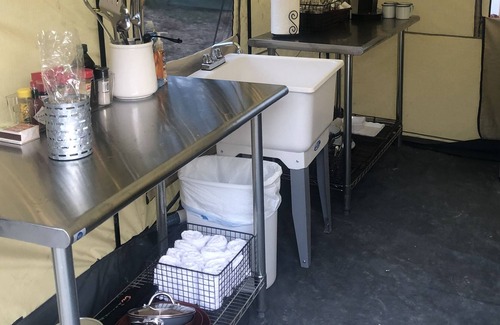 Enjoy glamping right on the Frio River! Stay in a yurt tent with queen bed and 2 plush cots. There is a separate cook tent with prep tables and sink. Just outside the tent is a charcoal bbq grill plus griddle and propane cook top. There is an outdoor heated shower and rustic outhouse. You can spend your evenings star gazing while sitting around the fire pit or relaxing in the hammock. You will have a little piece of your own paradise right on the Frio River!