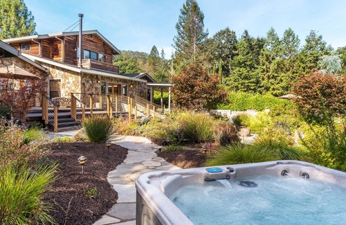The 1.25 acre creekside property is private and quiet. The house is 3500 square feet offering many different places for groups to gather, inside and out. Three of the bedrooms have their own en suite bath; the other two bedroom share a bath right across the hall. The perimeter of the property is lined with redwood trees. The lack of neighboring lights makes the stars especially bright. Nestled among oaks is a unique insulated tree house for guests to enjoy. The chemical-free pool is heated via solar panels May-October.* Enjoy your evening in the hot tub under the stars.