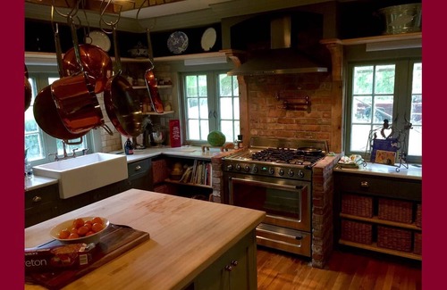 The fully-appointed kitchen defines state-of-the-art farmhouse, where a Smeg range nestles in the arms of a surround made from 150 year-old brick. A DeLonghi cappuccino maker rests beside a hutch crafted from 90 year-old barn wood, bringing your favorite café into this refined kitchen.
