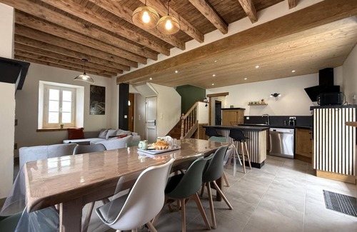 The Gliget gîte offers, first and foremost, an incredible panoramic view of the Aspe Valley mountains in the Béarn Pyrenees. Perched on a promontory, this detached house overlooks the surrounding countryside, and its 40 m² terrace faces unspoiled nature, on the heights of the village 3 km away (Lourdios Ichère). You are on a working farm, with the owners' farm below (sheep and dairy cows, farmhouse cheese for sale). Recently renovated, the interior offers all modern comforts, beautiful materials, and a refined, modern, and warm decor. Ground floor: 40 m² living room including: - Island-style kitchen area (refrigerator, dishwasher, dual gas and dual induction hobs, microwave, Nespresso coffee maker, raclette and fondue set) - Lounge area (wood stove, TV). No internet connection, but good 4G coverage for your smartphones. - Shower room (large shower, sink, toilet, washing machine). - 1 bedroom (1 double bed) Storage room in the outbuildings (freezer). Upstairs: 3 bedrooms: - 1 bedroom (2 double beds). - 1 bedroom (1 double bed with direct access to the courtyard via French doors on the ground floor). - 1 bedroom (1 double bed). - Shower room (large shower, sink). Separate toilet. Beds made upon arrival. Towels are available for hire. Baby equipment is available. Electric heating at an additional cost (meter reading), wood at an additional cost (first fire free). Large terrace overlooking the property with panoramic views, garden furniture, barbecue, and deckchairs. Private parking in the courtyard. Numerous hikes are possible from this site. Visits to the owners' farm are available on site, where sheep's milk cheese is available for sale. This is a mountain road; remember to bring snow gear in winter.