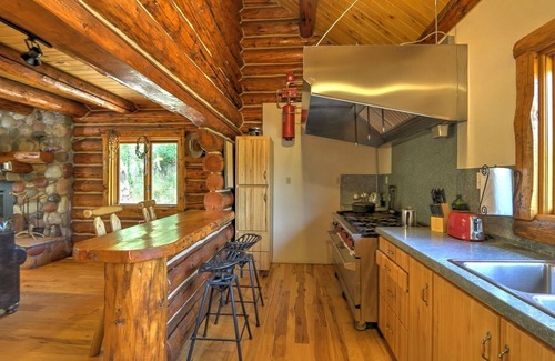 This lodge features an enormous dining area, well-equipped kitchen with a western feel, and a cozy seating area with leather furnishings and a beautiful fireplace. The hand-crafted staircase leads to three comfortable bedrooms and a shared full bathroom.