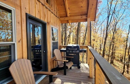 Enjoy the beautiful views in a 4-6 person cabin nestled amongst the trees. Watch the sunset or cook on the grill from the large private deck overlooking Tappan Lake, Ohio complete with handcrafted Adirondack chairs. Seasonally, you can relax in a hammock chair under the cabin while watching the boats pass by. The midsize cabin gives you everything you need. From the fully stocked kitchenette, mini refrigerator, Keurig, USB charging station, central air + heat add comfort to your peaceful & rustic stay. When it's time to rest, you will get a wonderful night's rest in 1 of the 2 loft twin beds, queen bed or full size futon, all with luxury linens & pillows provided.