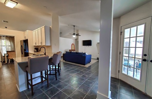 Inside, the home boasts a comfortable living area with a sofa bed and a game room, perfect for family game nights or relaxing after a day of exploring. The well-equipped kitchen features modern appliances, including a fridge, stove, oven, and dishwasher, making meal preparation a breeze. With amenities like central AC, WiFi, and cable TV, you’ll have all the comforts of home at your fingertips.