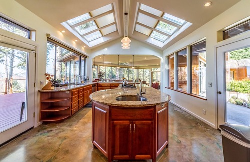 Enjoy a well-deserved break at this beautiful home surrounded by nature's beauty. Floor-to-ceiling windows offer forested views from the living room, dining room, and much of the kitchen. Prepare full-course meals for your entire group in the gourmet kitchen, and then head outside to enjoy the furnished patio and the two-and-a-half acres where you and your four-legged family member can get out and play.