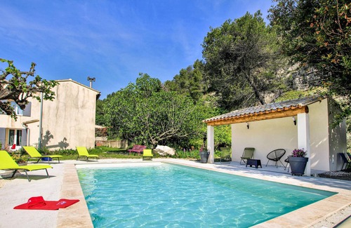The spacious garden with shrubs, flower beds and a picnic area is nestled against a beautiful limestone cliff. Relax under the shelter of a centuries-old tree on the large, semi-covered terrace with garden furniture and barbecue and cool off in the pool on warm days.