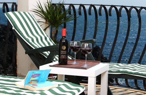 The "Acqua" house is an elegant three-room apartment which is well inspired by the external context with its blue walls that are almost "enveloped" by the blue frame of the sea in front. It is located on the Ionian coast not far from the center of Acireale, a splendid town on the slopes of Etna, halfway between the city of Catania and the famous tourist center of Taormina.
