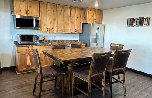 The main level has one bedroom (king), 1-1/2 bathrooms, a laundry room, and a gorgeous open-concept area with an incredible kitchen and island, breakfast bar, dining area and living room with stunning lake views. The French doors open to a spacious covered deck with a comfortable sitting area, a dining table and an outdoor kitchen with a sink and propane grill for guests to use. The deck has retractable screens which can be raised for unobstructed views or lowered to keep out bugs or reduce unwanted wind. Steps from the deck lead down to a grassy area where guests can sit and enjoy the views or play yard games.
