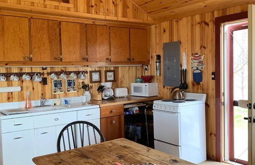 Accommodations include 2 bedrooms, large sleeping loft with 2 twin beds and 1 bathroom; full kitchen with 20 inch electric range and full sized refrigerator and large farm table that easily seats eight; living and family room with rustic wooden furniture, Tivoli radio with iPOD nano connection. Cottage has tongue and groove pine paneling with a cathedral ceiling in the main living area. There is a large front deck with 4 Adirondack chairs. Driveway allows parking for several vehicles. External electrical outlet is available for an RV.