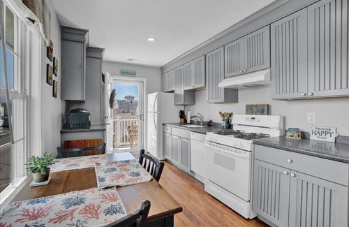 The living room boasts plush, oversized sofa inviting you to sink in and relax after a day in the sun. A reclaimed wood coffee table sits at the center, adding a touch of rustic warmth to the space. Small dining room table perfect for breakfast is located in the kitchen area. But, don’t eat there. Bar top table that sits four is just outside on the balcony where panoramic views of the ocean inlet and bay stretch out before you, painting the sky with hues of orange and pink as the sun sets. There are also two high back chairs with a table in between that are perfect for morning coffee. The other deck hosts the outdoor grill for easy use by the kitchen. The decks and location of this condo are unmatched. Best views in Strathmere!
