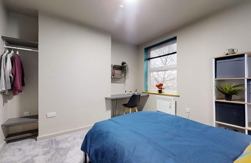 The Green Room has a double bed, a desk and chair and generous space for clothing and luggage.