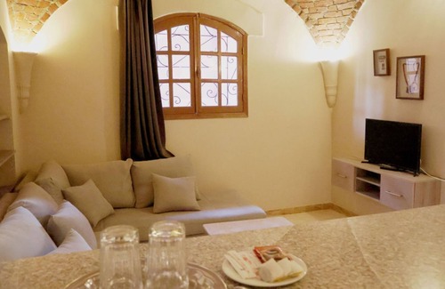 Escape to the enchanting edge of the desert with our ground floor, domed two-bedroom apartment, nestled on the serene West Bank of Luxor, a stone\'s throw from the historic Habu Temple. Your comfort is assured with two well-appointed bedrooms, one featuring a double bed and the other with twin beds, both equipped with air conditioning for your convenience. The living room invites you to relax on the soft sofa, enjoy your favorite shows on the TV, and make use of the handy minifridge and kettle. The spacious bathroom boasts a walk-in shower, along with a sink and toilet, ensuring your stay is comfortable.