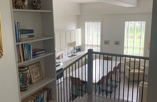 Two bedroom ground level with the two bedrooms up a short flight of stairs. Both bedrooms are large enough for a desk and sitting area and open to a brick garden terrrace. The lower level consists of a 11' high ceiling, spacious kitchen and living room overlooking the water 100' away. Half bathroom is located just off the living space and has a washer and dryer which can be closed off with a pocket door. Starlink internet is available with a smart TV.