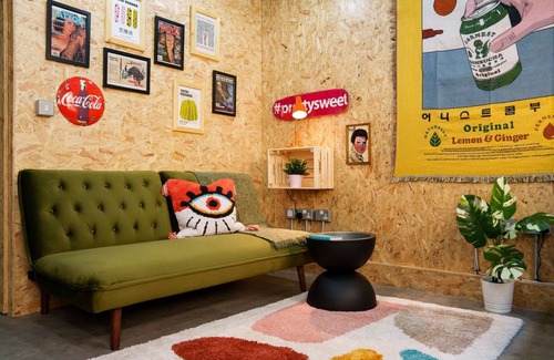 The living room is full of charm, with bold, eclectic décor and vibrant pops of colour. The cozy green sofa invites you to unwind, while curated wall art and vintage-inspired touches bring a playful, stylish vibe. Stay connected with high-speed Wi-Fi, and enjoy entertainment on the 42" flat-screen TV, complete with Netflix and live TV.