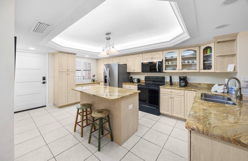 Inside, the condo offers a spacious and open layout filled with natural light. The living room is both comfortable and inviting, opening onto a screened lanai where you can relax in the shade while watching the waves roll in. The fully appointed kitchen includes a breakfast bar, and the adjacent dining room provides space for shared meals or quiet mornings with coffee.