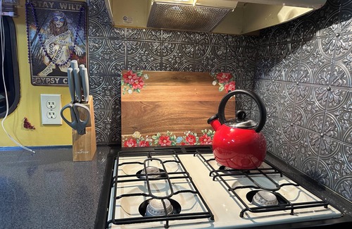 When you first walk inside you will enter through the kitchen that is equipped with propane stove, microwave, Keurig coffee maker, fridge/freezer, utensils. We provide sugar, salt/pepper, olive oil.