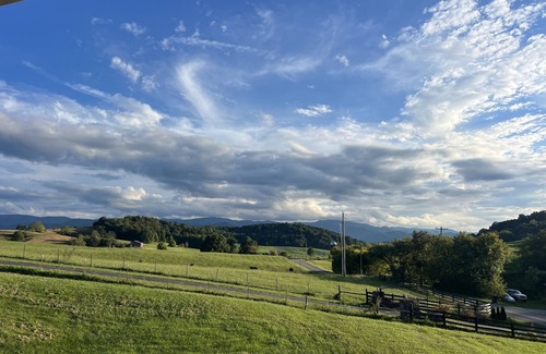 Large apartment. Queen size bed. Heat pump. Also electric fireplace in the bedroom. Nice getaway in a peaceful country setting. Attached carport to park under. Covered porch beautiful views mountains and farm land. Large shower with two fixtures rainfall type shower and a wand. Washer dryer. Full kitchen. T mobile Wi-Fi. Two flat screen t v. Stay the night or stay the month.