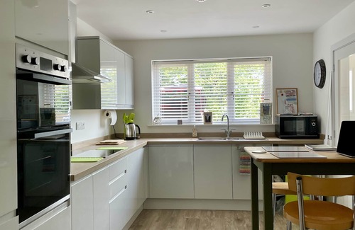 Glass doors lead to a light, airy living room with a corner sofa, armchair and large oak table which seats 6 or even 8, there is plenty of room for board games or a jigsaw (found inside our coffee table). Our smart TV is wall mounted and 55 inches; you can use our Netflix, Amazon and iPlayer account or sign in to your own.