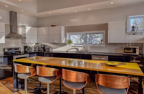 The residence includes four generously sized bedrooms and two bathrooms, accommodating families or groups with ease. The open-concept main floor combines a living area, TV lounge, dining space, and billiards area around a central staircase leading to the lower level. At the back, a chef’s kitchen with a large island invites you to prepare meals while staying connected to the lively main space. The master bedroom and main bathroom with a separate bathtub and shower complete the first level.