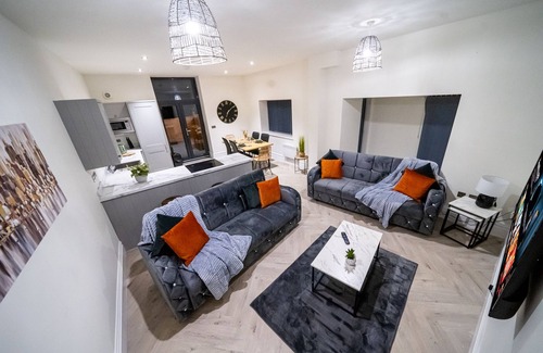 This stylish 3-bedroom/1 bathroom and ensuite shower room with toilet downstairs come with 4 single bed 2 sofa beds and 1 Double bed. This clean house is able to sleep 8 guests comfortably. Built to the highest standard this is very Spacious house comes with a big private garden and a spacious living room with a 65-inch TV with plenty of movie apps. Free coffee, and tea, are included. The luxury kitchen is fully equipped for all your cooking needs with appliances and utensils. The bathroom includes a dispenser with soap, shampoo, and conditioner. Private parking is also available and open plan living make these homes perfect for professionals and families.