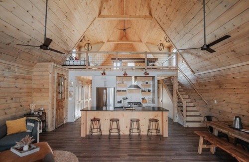 A-Frame cabin on Hemptown Creek just minutes away from downtown Blue Ridge! The 1600 square foot cabin sleeps 6, with three queen size beds and a full bath. The 18th century door opens to a modern kitchen with luxury gas appliances and beautiful leathered granite, across from the kitchen is a gas pot belly fireplace stove with two swivel chairs in the study, opposite the seating area is a dining table that seats 6. As you continue on the first level there are two bedrooms that open onto a private deck, each equipped with Adirondack chairs, memory foam queen beds, and a 47" SMART TV. Above the first floor sits a 400 square foot loft, complete with queen size daybed with memory foam mattress, 9' shuffleboard table, leather sofa, and a 65" SMART TV. Views from the windows overlook the North Georgia Mountains and are framed out with rustic lighting made custom from old whisky barrels.
