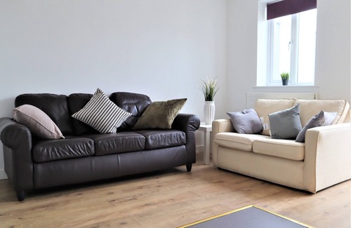 Open plan living area with a kitchen, dining area and sitting area with sofa bed available on request.