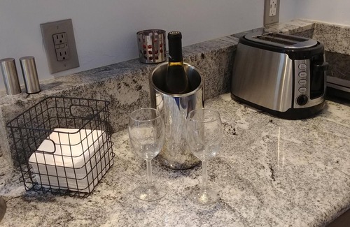 The luxurious air conditioned suite is anchored by a bedroom/sitting room (bed has a queen Euro pillow top mattress), opening through French doors to a relaxing patio, complete with fire pit. The unit has a kitchenette with all the amenities: bar sink, undercounter fridge, microwave, Keurig coffee maker, induction plate with cooking pots, toaster, dishware, silverware and a bottle of wine for your enjoyment upon arrival.