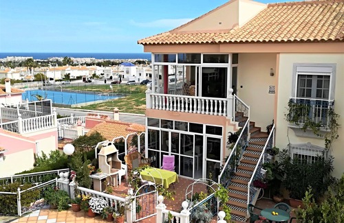 The apartment with winter loggia meets the demands of high standards. A fully equipped kitchen in a modern design with a dishwasher is at your disposal. You will find satellite flat screen TV, WiFi, stereo / DVD in the open, large living room. A large terrace offers an incomparable, wide view of the nearby sea, the nearby salt lakes, the marina and the city of Torrevieja. The quiet apartment has an exquisite bathroom. Two bedrooms in Spanish style, one with a small balcony, let southern dreams run free. Experience incomparable sunrises over the sea. In the evening on the terrace, with soft music and cool champagne, the glitter of thousands of lights over the city enchants. The hustle and bustle down there doesn't really appear and the soul quickly feels relaxation. You see the complex with a large pool, surrounded by tall palm trees and lush, Mediterranean vegetation. The beauty and flair of Las Fuentes will also enchant you. Enjoy your vacation in one of the most beautiful, quiet and well-kept resorts in southern Spain. Find relaxation amidst palm-clad gardens and a refreshing pool. Warmth, sea and fresh, aromatic air await you on the southern Costa Blanca. The large pool provides cooling in between and the sea is quickly accessible. Feel at home in an apartment with a special design. The furnishings and technology will also meet your most convenient needs. WLAN and satellite flat-screen TV connect them to the world at any time. Spend your 'most beautiful days' carefree! Our nice German-speaking property manager will be happy to assist you.
