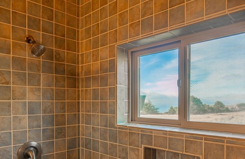This roomy 1560 square foot home sleeps up to six with two bedrooms and an open library with a sofa bed. The house is ideal for 4 adults but will accommodate up to 6 adults maximum. (Please note there is a $20 extra guest fee per day for 5th and 6th guests.) The master bedroom features a Cal King bed with new mattress topper, Smart TV, walk-in closet, and a fully tiled shower for two. The downstairs bedroom has a brand new KING bed and tiled shower with bathtub. The bedrooms are on opposite sides of the house, and each has its own deck. The marble gas fireplace, sound system in each room (presently working on upgrading!) but we have NEW Sonos speakers in Kitchen & livingroom for music streaming-excellent sound quality, and lights with dimmers throughout the house set the ambiance for sheer bliss. There are five separate decks, over 900 square feet in all. You can also relax in the NEW very private, six-person, outdoor spa, right outside the master bedroom slider and gaze at the stars or enjoy the sight and sounds of the ocean!