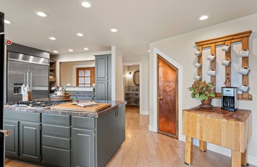 The fully equipped chef’s kitchen boasts high-end appliances, abundant counter space, and a walk-in pantry with a distinctive custom copper door. With a view of the backyard oasis, the elegant formal dining room is ideal for sharing memorable meals with family and friends. The kitchen includes a refrigerator, microwave, dishwasher, stainless steel stove, blender, coffee maker, and toaster, ensuring effortless meal preparation. It’s also stocked with essential cooking basics like pots, pans, oil, salt, and pepper to make your culinary experience even more enjoyable.