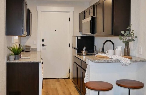 There is a cozy living room with a TV, a great kitchen with all the amenities you'll need to make a meal in, and the bathroom and bedroom are a retreat with fresh linens and great ambiance and decor.
