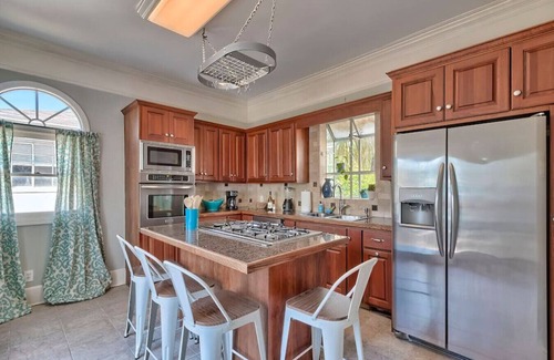 -an eat-in fully stocked Kitchen, w/ island complete with a gas cook top, all cooking essentials, 4 bar stools and stainless steel appliances