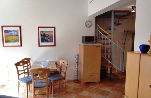 The offered apartment is located in the holiday park Seedorf, a district of the famous seaside resort of Sellin directly on Lake Neuensiener in charming Bodden landscape. In the resort there is a children's playground, a bicycle rental, a restaurant, bakery with goods for daily use is also available. From May to October they have a shuttle service from the resort to the beach. Four other restaurants in the village are within walking distance. The apartment has an underground parking space directly on the property. In the maisonette apartment you reach the bedroom and the nursery via a spiral staircase. The apartment is bookable for a maximum of 2 adults and 2 children up to 17 years.