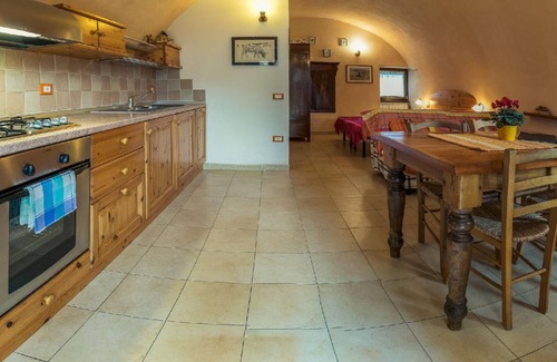 Thanks to the arched ceiling and solid wood furniture there is a welcoming medieval atmosphere. The large kitchen is equipped with a dishwasher, microwave, gas stove, oven and fridge with freezer. There is also a dining table with chairs, a sofa bed for two people and a satellite smart TV. In the sleeping area there is a double bed (160 x 190 cm) and a wardrobe. The bathroom has a shower and washing machine. The studio apartment is equipped with an independent heating system.
