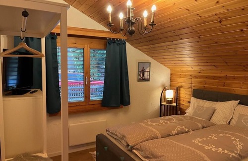 The 2.5-room apartment extends over the eastern part of the attic and is easily accessible via the staircase (1st floor).This rustic 2.5-room apartment impresses with its charm and offers a generous living space of around 45m² in an extremely quiet environment.As you enter, the entrance area with cloakroom welcomes you.Here you find yourself at the beginning of the cozy and rustic living room with access to the panoramic balcony.On the left is the bedroom, while straight ahead you reach the spacious bathroom with toilet and shower.The bedroom faces the back and is extremely quiet, with enough space for your wardrobe.The living room, equipped with a separate and lockable sleeping alcove and mattress 140x200cm as well as a pull-out couch with 150x190cm, is flooded with light through the generous windows to the balcony.The sloping roof gives the living area a cozy atmosphere that is characterized by warmth and a holiday mood.The rustic kitchen, equipped with electric plates and a dishwasher, offers sufficient storage space for all kitchen appliances and supplies.The table with 4 chairs can be pulled out or you can simply eat on the terrace. The living room leads directly to the spacious balcony, from which you can enjoy a breathtaking view of the majestic mountains of the municipality of Tujetsch. 1 parkingspace next to the house - others cars not possible