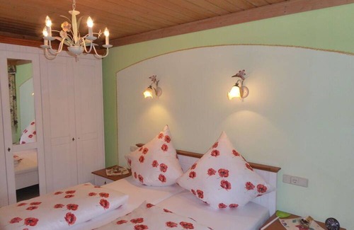 The large apartment with new equipment (2017) and view of the mountains is located on the 1st floor with southern balcony (11qm), Eastern Balkon (13qm). Grill facilities, play and lying area on the 5000 square meter property with pond. ++++ This apartment is also suitable for 2 friends. ++++ The apartment is 150 sqm and consists of living space = 24sqm, eating kitchen = 22qm, 4 bedrooms with double beds, bathroom/shower/toilet = 10sqm, additional separate shower/toilet for 2 bedrooms. 150 sqm fitness area with many training equipment and table tennis table, pool 4 x 2 m, 1.3 m deep with 2 sparkling and 2 massage jets, steam and Finnish sauna. In the basement there are 2 other holiday apartments with a level entrance.
