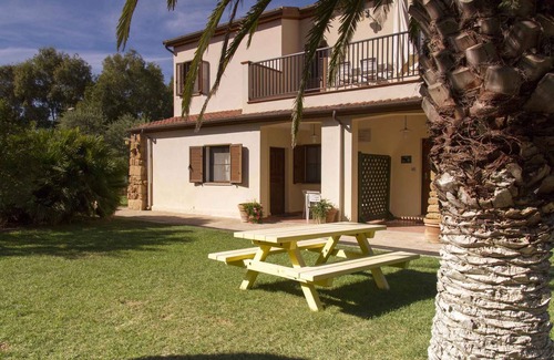 The holiday apartment is located in an apartment house, was renovated in 2005 and is furnished in a rustic and typical country style. Also due to the view over woods from the property and its quiet, sunny and secluded location at the edge of the forest the domicile is popular. Available for use: sunbathing lawn, parasol, sun lounger, children's playground, swing, barbecue facilities, terrace, campfire site and courtyard.LocationAlghero. The holiday apartement is located on a open enclosed garden plot with meadow and trees. The landlord does not live in the house or on the property. Access is via a side road or directly from the main road (asphalted). Parking is available on the property. Specialair conditioning.Facilities: children's toys, baby cot, high chair, internet access (WLAN), safe, iron and washing machine. TV reception takes place via satellite. PoolAll pools are available for shared use. Outdoor pool (usable from early April to end of October, 6 m x 12 m, depth 2,60 m). Dogsallowed, EUR 15.00/pet per day. DistancesShopping 3 km, restaurant 100 m, town center 14 km. Alghero: railway station 11 km and airport 9 km. bank in Fertilia 6 km. In summer: Rada di Alghero 7 km in Alghero (beach 7 km in Alghero featuring sand). DivisionHoliday apartment, 1 floor, 3 rooms (including 2 bedrooms), 50 sqm, in total 5 beds (including 1 additional bed). RoomThe entrance to your holiday apartment is located on the mezzanine floor and leads over 5 steps and an external staircase. Living room with sitting area, TV, dining area (6 seats) and (garden furniture, 1 table, 4 chairs, parasol). Bedroom with 2 single beds and 1 additional bed on couch/sofa (only suitable for children). Bedroom with 1 double bed and (1 table, 4 chairs). Cooking nook in the living room with TV, dining area (6 seats), gas stove (3 flames), electric stove (induction stove), oven, extractor hood, fridge (icebox) and washing machine. Bathroom with washing machine, shower, 1 washbasin, WC, bidet and hairdryer. Terms of lease and pricesIncluded in the priceOutdoor pool, internet access, air conditioning, parking place, final cleaning, local tax (under 12 years), bed linen, sunloungers, hand towels (first usage), Wireless Internet access. Side costs-Costs on the spot:/Obligatory:local tax by local tariff (if charged).On request:bathing towels 5 € per person per change.Deposit:EUR 300,-/object.