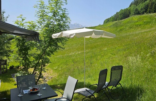 The outdoor area offers the perfect setting to enjoy the fresh mountain air and the calming tranquillity of nature with a garden seating area, garden chairs and loungers as well as a light-flooded conservatory with dining table and chairs. These areas invite you to unwind with a cup of coffee in the morning or a relaxing drink in the evening and admire the surrounding landscape.