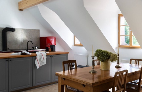 This flat is the perfect choice for those seeking a balance between luxury and nature. With its historic charm, modern and comprehensive facilities and idyllic location on the edge of the forest, it offers the ideal setting for an unrivalled stay. Don't let this opportunity pass you by and experience a time-out like no other - we look forward to organising your stay according to your wishes.