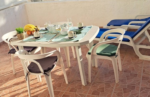 This vacation rental offers a private outdoor terrace and access to a shared outdoor pool. Inside, there is also a shared indoor pool for your enjoyment. The terrace boasts a beautiful sea view.