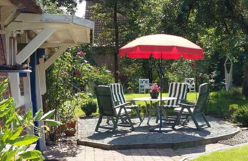 This very cozy thatched roof cottage with the 1000 sqm orchard including terrace invites you to spend the most beautiful time of the year here. The beautiful all-round fenced garden is ideal for relaxing and a very special treat for dogs. . In spring the apple blossom, in summer the rose blossom and in autumn the apple harvest... On the ground floor there is a kitchen with washing machine and dishwasher, a bedroom, a living room with dining area and a shower room. In the upper area of the house there is a large studio room, which is designed so that even two people can feel like they have their own room. You can safely store your bicycles in the lockable garden shed The holiday home is located in a quiet, small cul-de-sac and yet in just a few minutes you can be in the center of the town with all the shops including an indoor swimming pool and doctors.