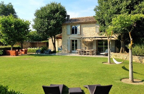 This beautiful ancient barn converted into a contemporary house offers a Kitchen, a living room (with fireplace), three bedrooms in the house, 2 bathrooms, a studio at the pool with indoor and outdoor bathrooms, and a very large garden (1.2 ha going over the hills with stunning views of the surrounding hills, the village of Ménerbes, the Luberon and the Mount Ventoux). It sleeps 10 people. You will find a large heated pool (17x5 m), Wi-Fi Internet, telephone, television, washer, dryer etc.. Bed and bathroom linen are included.