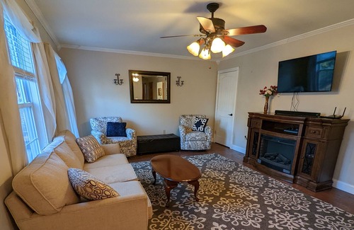 Ranch, single-family home in quiet setting with 3 bedrooms sleeping up to six. A full-sized, stocked kitchen and dining, living room with electric fireplace, and large outdoor area are available for your relaxation.