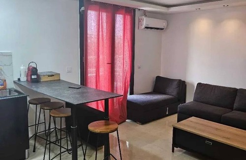 The interior of the apartment is designed for your comfort, with a bright living room featuring a convertible sofa for one person. A dining area is accessible, perfect for sharing delightful meals. You will also find a dressing room for optimal storage of your belongings and a fully equipped kitchen, ready to satisfy chefs. Modern amenities such as air conditioning and Wi-Fi are also available.