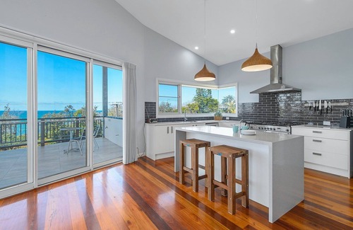 Modern spacious family home with pool, 4 beds, sleeps 8 guests. Several entertaining areas. Enjoy the mornings on the front deck overlooking the ocean, retreat to the back covered entertaining area with pool in the afternoons. Located on prestige Honeysuckle Road on the Bonny Hills headland. Shelly Beach is straight across the beach, walk to 4 beaches, outdoor walking tracks straight in front of your door. Large open plan living, dining and kitchen area. Kitchen with gas stove, Miele fridge and freezer and seperate bar fridge. Timber floors through out, carpeted bedrooms. Free WIFI, smart TVs.